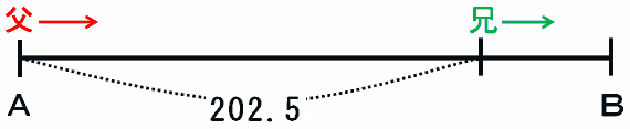 父は15の速さで兄を追いかけるので、追い付くまでにかかる時間は、(202.5)÷(15-10)=40.5分=40分30秒になります。
