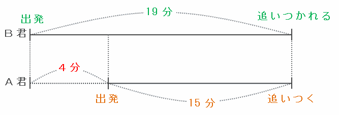 B君がスタート地点を出発してからA君に2回目に追いつかれるまでの19分間を図に表してみると次のようになります。