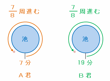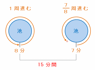 また、残りの15-8=7分間で、次の図のように池のまわりの7÷8=8分の7だけ進み、その地点でB君に追いつきました(2回目)。