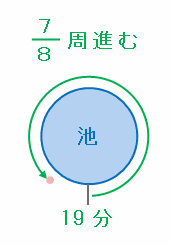 一方、B君は19分間でA君に2回目に追いつかれた地点まで進んだはずなので、次の図のように19分間で池のまわりの8分の7を進んだことが分かります。
