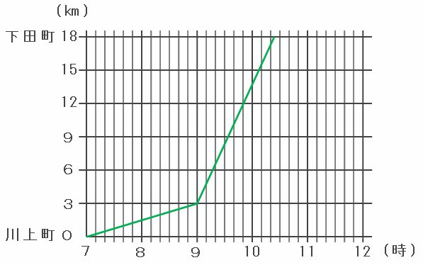 下のグラフは、Bが川上町を出発してからの様子を表したものです。ただし、横軸は時刻、縦軸は川上町からの距離を表しています。次の問いに答えなさい。